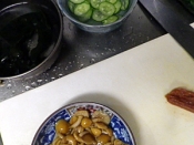 今日の夕ごはん よだれ鶏 舞茸とカニカマの天ぷら きゅうりとワカメの酢の物 ネギとなめこのお味噌汁 美味しくできた なめこが沈んじゃって見えない ツイレポ